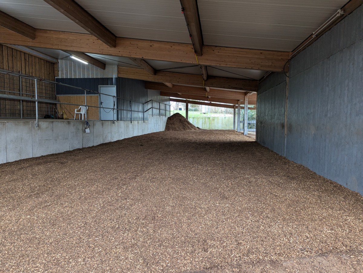 Unsere Liegehalle ist mit Waldboden eingestreut und wird im Sommer zur Staubbindung beregnet