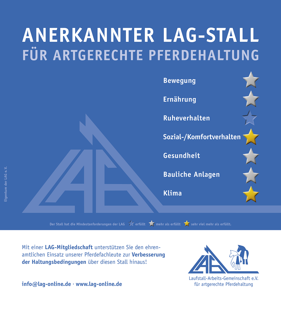 Die Nutzung der Reitanlage ist inklusive. Dort findet man die Sattelkammer und das WC, die Unterbringung von Zusatzfutter ist auch möglich es gibt Putzplätze mit Licht und Wasser. Eine kleine Reithalle, zwei Außenplätze und einen Roundpen können ebenso genutzt werden. Das Ausreitgelände ist direkt ab Hof da.