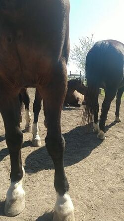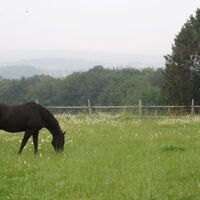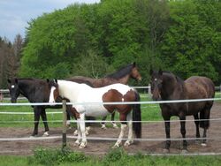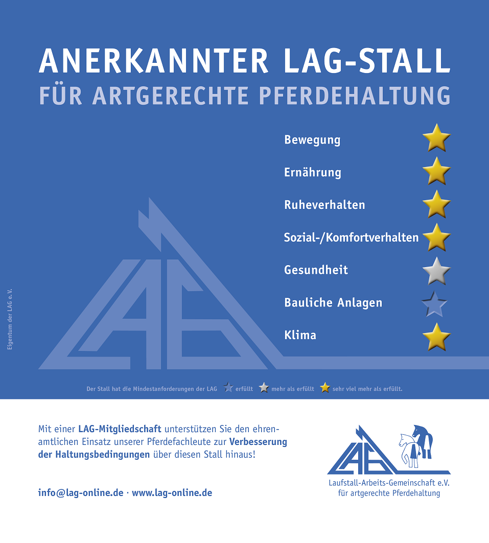 Auf Gut Breide können Sie Ihr Pferd an einem persönlichen Lebenstraum teilhaben lassen: Pferde artgerecht zu halten ihren Bedürfnissen als Lauf- und Herdentiere entsprechend! Damit sie sich wie in der Steppe 18 Stunden täglich an der frischen Luft fortbewegen können, gibt es Bewegungsställe für kleine Gruppen von maximal 2 - 5 Pferden mit getrennten Freß- und Liegebereichen. Die Stallböden sind Drainagematten oder Lehm mit hohem Tonanteil, kein Stroh, da wir damit keine guten Erfahrungen haben. Rund um die Uhr wird Heu aus Heuglocken unter Netzen witterungsgeschützt mit 6 Fressplätzen pro Glocke zur Verfügung gestellt. Einer der drei Paddockbereiche verfügt zusätzlich über Einzelfressstände zur Gabe von Kraftfutter oder Zusatzfutter, wo auch Rang niedrigere Tiere in Ruhe fressen können. Bei dieser Haltungsart können die Pferde freiwillig ihr Immunsystem trainieren und sich mit ihrer Fähigkeit als Klimawiderständler auch bei Wind und Regen oder Hitze ganzjährig und immer selber entscheiden, ob sie in den Stall gehen wollen oder eben nicht. Durch viel frische Luft, ganzjährigen Weidegang (im Sommer bis zu 24 h) und bestes Bio-Futter sowie Kräuterwiesen bleiben nicht nur ihre Atmungsorgane gesund. Weiterhin achten wir auf Artenvielfalt bei den Gräsern und darauf, dass fruktanarme Gräser sich etablieren, um Gefahren wie der Hufrehe keine Chance zu geben. Für besondere Artenvielfalt dieser Gräser haben wir bereits einen Preis gewonnen, ausgeschrieben vom Naturschutzbund und der Landwirtschaftskammer. Mit einem sorgfältigen Weidemanagement sorgen wir dafür, dass die Pferde gerade im Winter Flächen zumindest stundenweise wechselnd beweiden. Mit Herdenhaltung in Offenställen, die von jeder Wiese aus zugänglich sind, gönnen wir unseren Tieren die Sozialkontakte, die sie zur seelischen Gesundheit brauchen. Die Gruppe ist individuell zusammengestellt und jeder Neuling wird langsam und sensibel mit viel Beobachtung integriert. Zusätzlich besteht die Möglichkeit, ein Training Natural Horsemanship zu buchen, um eventuelle Missverständnisse in der Kommunikation mit dem Pferd auszuräumen. Gut Breide bietet einen beleuchteten Reitplatz 20x40m, Longierzirkel, Reiterstübchen, kleine Halle 12 x15 m. Wir stellen derzeit eine neue Gruppe zusammen und können Ihnen zwei Plätze für hinten barhuf Vierbeiner anbieten, eine seltene Gelegenheit bei uns. Auch für einzelne Pferde gibt es Möglichkeiten der Integration. Willkommen für einen ersten telefonischen Kontakt Pferd plus Mensch, die gut in unsere kleine Gemeinschaft passen. Weitere Fotos bei stall-frei.de